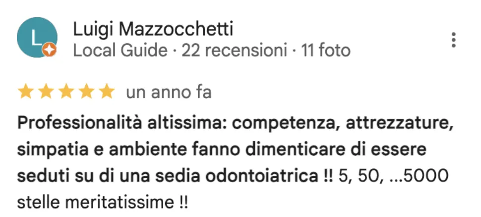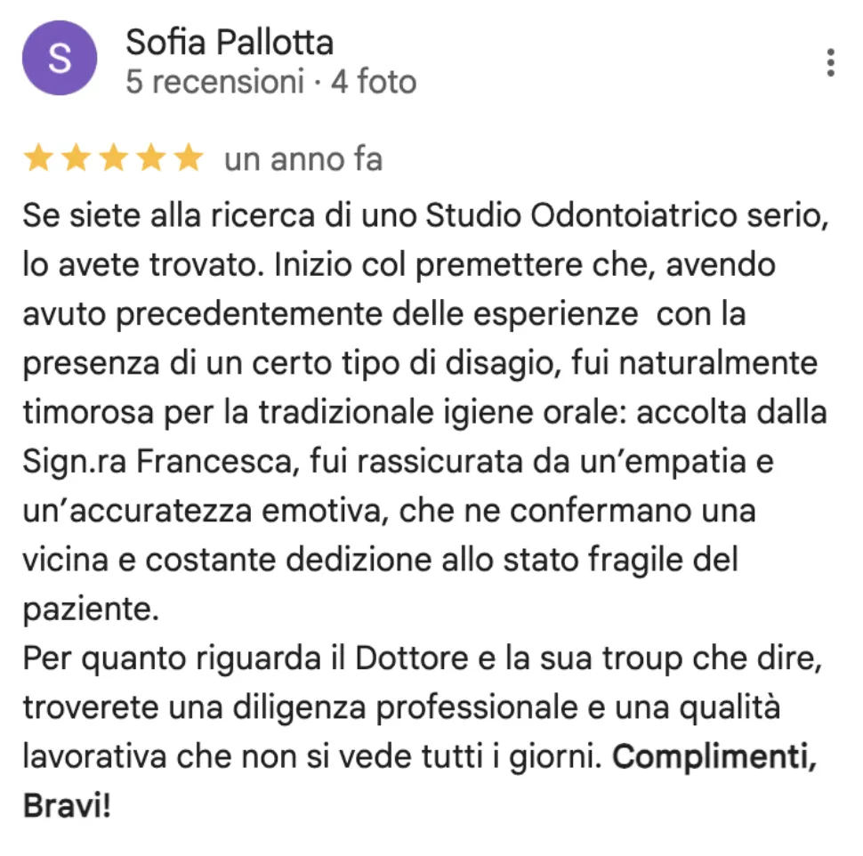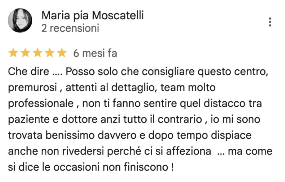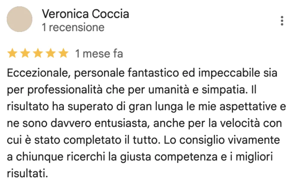 “Tutto il team è estremamente professionale: ho trovato serietà, pulizia disponibilità e soprattutto simpatia/empatia.”