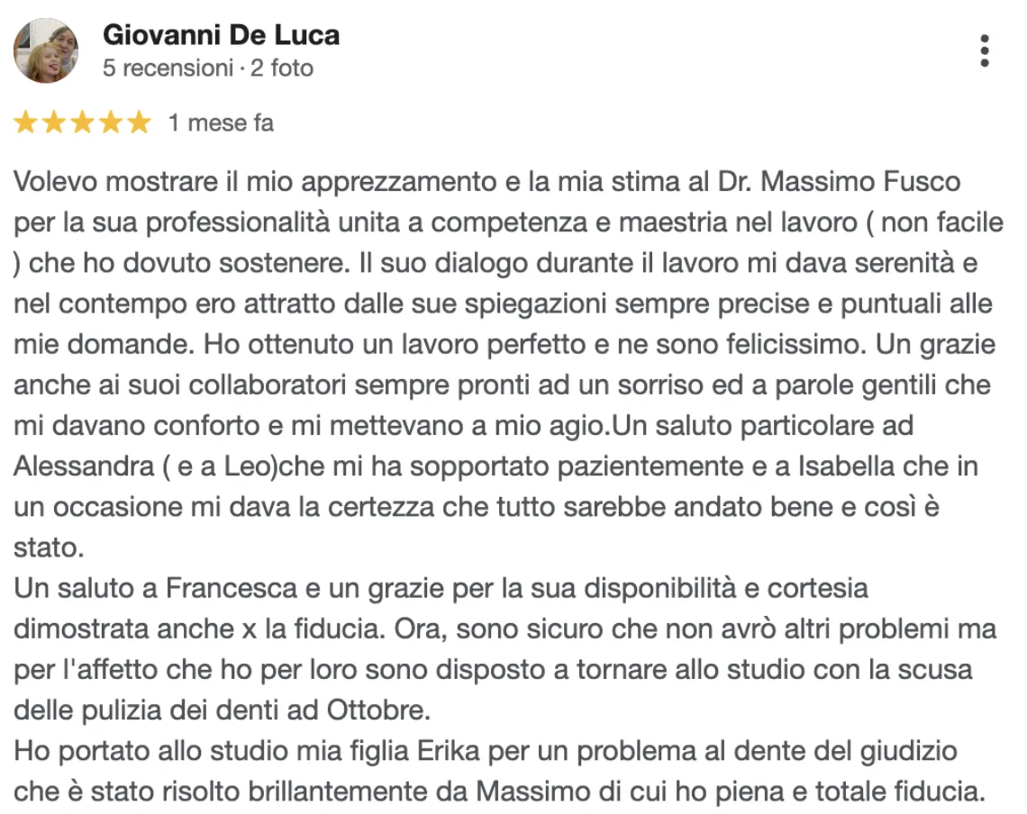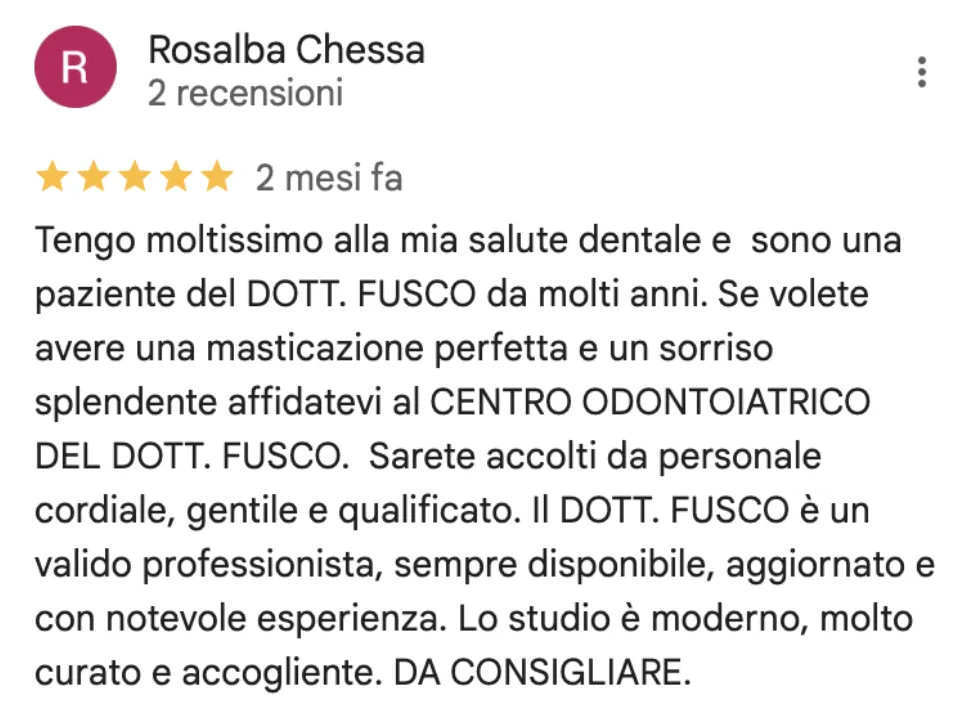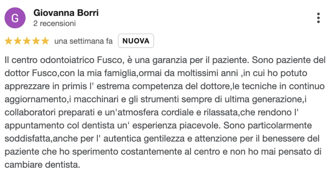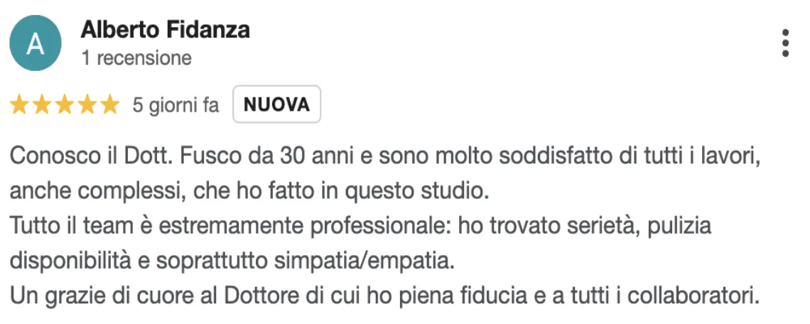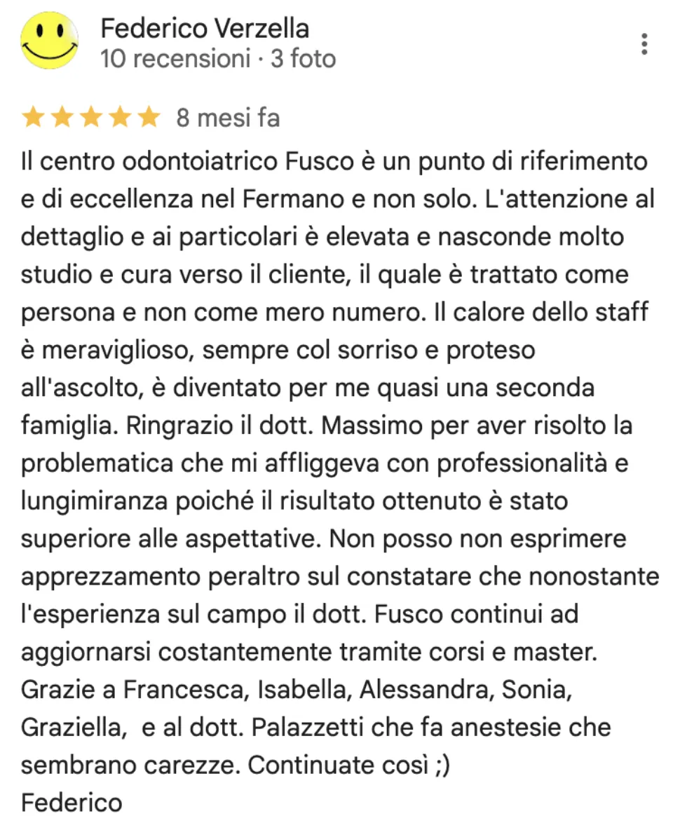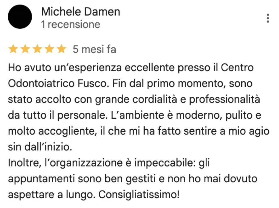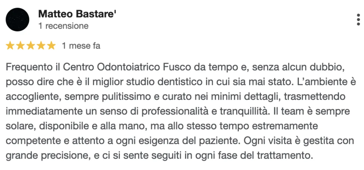 “Frequento il Centro Odontoiatrico Fusco da tempo e, senza alcun dubbio, posso dire che è il miglior studio dentistico in cui sia mai stato.”